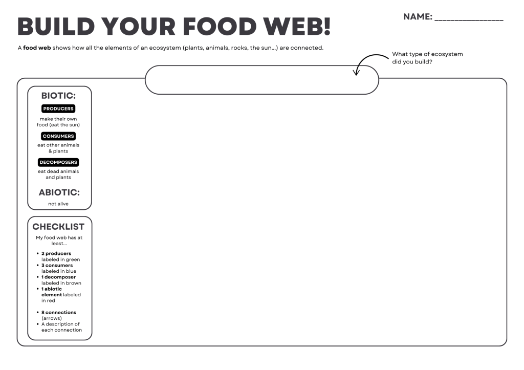 Students will create and label their own food webs to demonstrate their understanding of the preceding lesson. Students will be provided with printouts of various ecosystem elements (animals, plants, fungi…) which they will cut and paste onto their food web worksheet. Alternatively, if desired, students may draw their own elements from scratch. Students will then use coloured markers to identify each element’s role in their food web and some of the interactions between elements. Before starting the activity review the checklist with the class and show them an example of a completed worksheet.