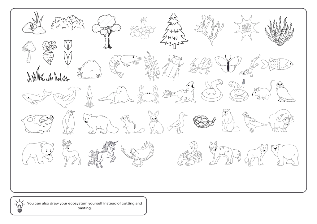 The students should be encouraged to colour and artistically engage with the activity. Allowing more time for students to sit with the activity will encourage deeper reflection on the content. For some students this reflection on the material with prompt them to ask more complex questions about ecosystems. For example: “Birds of prey often eat roadkill, does that mean they are decomposers?”, “Do chipmunks eat bugs!? That’s gross, I thought they only ate nuts.”, “This one type of sea slug can photosynthesize! Does that mean it’s a plant?” Encourage students to ask difficult questions, and have them discuss the answers with their peers before sharing your answers. Remember that biology is exciting and often defies definitions!